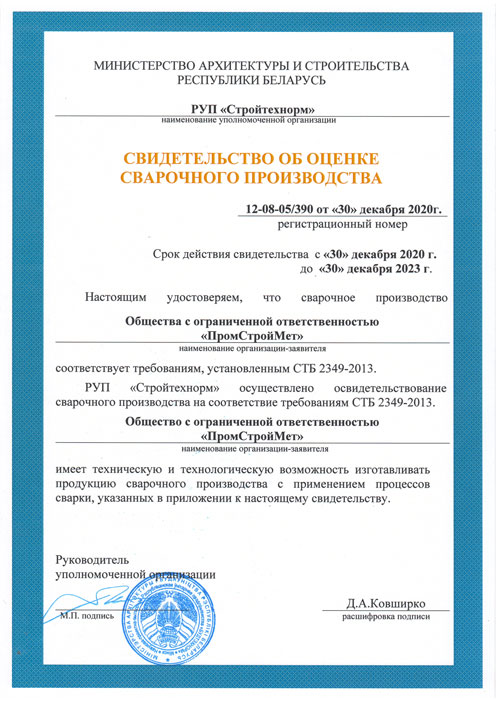 Техническое оснащение и уровень квалификации специалистов компании позволяют производить продукцию в соответствии с технологическими процессами, соблюдая правила техники безопасности. Выпускаемая продукция выпускается в соответствии с требованиями нормативно-технической документации. Качество изготавливаемой продукции подтверждается наличием Свидетельства о технической компетентности, ряда Сертификатов соответствия, Свидетельства об оценке сварочноо производства и др. (сертификаты).
