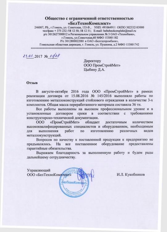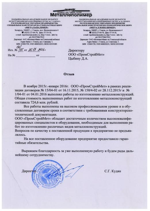 Выражаем благодарность за уже выполненную работу и готовы рекомендовать ООО «ПромСтройМет» как квалифицированного и компетентного производителя строительных металлоконструкций![]()