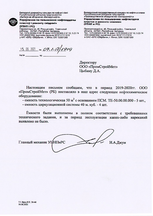 Настоящим письмом сообщаем, что в период 2019-2020 гг. ООО «ПромСтройМет» (РБ) поставляло в наш адрес следующее нефтехимическое оборудование: