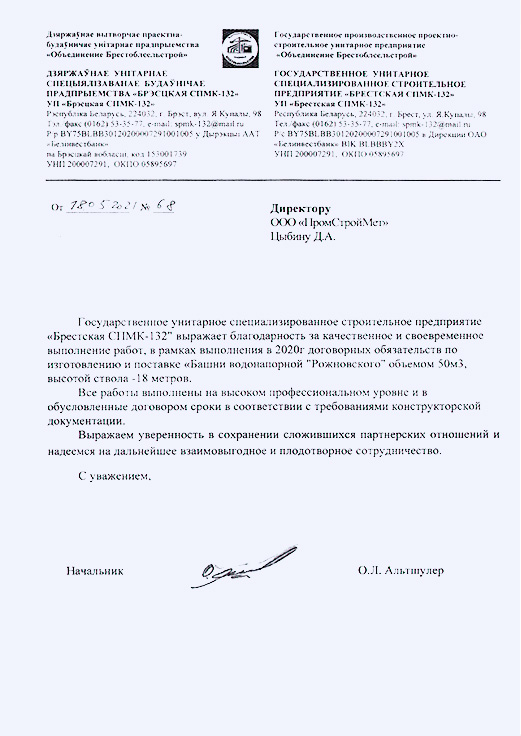 Государственное унитарное специализированное строительное предприятие «Брестская СПМК-132» выражает благодарность за качественное и своевременное выполнение работ, в рамках выполнения в 2020 г договорных обязательств по изготовлению и поставке «Башни водонапорной "Рожновского" объемом 50мЗ, высотой ствола - 18 метров.