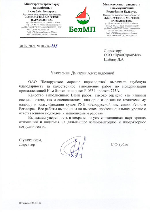 ОАО «Белорусское морское пароходство» выражает глубокую благодарность за качественное выполнение работ по модернизации принадлежащей Нам баржи-площадки Р-0554 проекта 775А.