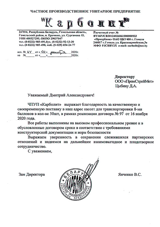 ЧПУП «Карболит» выражает благодарность за качественную и своевременную поставку в наш адрес кассет для транспортировки 8-ми баллонов в количестве 50 шт., в рамках реализации договора № 97 от 16 ноября 2020 года.