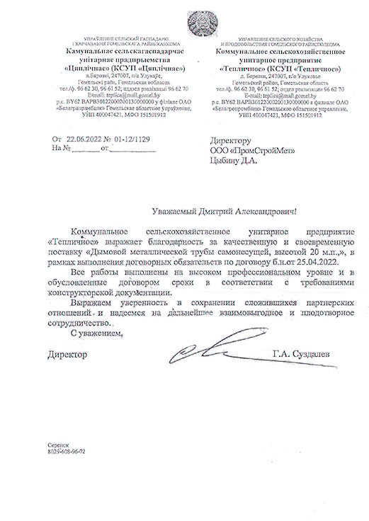 Коммунальное сельскохозяйственное унитарное предприятие «Тепличное» выражает благодарность за качественною и своевременную поставку «Дымовой металлической трубы самонесущей, высотой 20 м.п.», в рамках выполнения договорных обязательств по договору б/н от 25.04.2022.