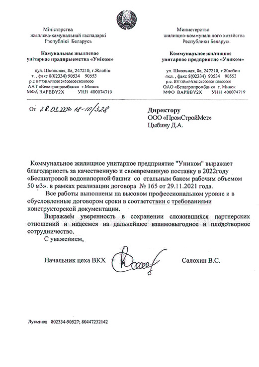 Коммунальное жилищное унитарное предприятие "Уником" выражает благодарность за качественную и своевременную поставку в 2022 году «Бесшатровой водонапорной башни со стальным баком рабочим объемом 50 м3», в рамках реализации договора № 165 от 29.11.2021 года.