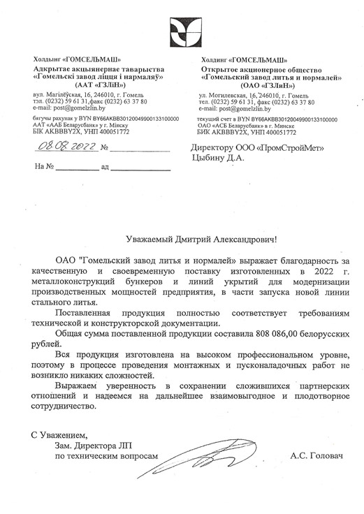 OAO «Гомельский завод литья и нормалей» выражает благодарность за качественную и своевременную поставку изготовленных в 2022 г. металлоконструкций бункеров и линий укрытий для модернизации производственных мощностей предприятия, в части запуска новой линии стального литья.