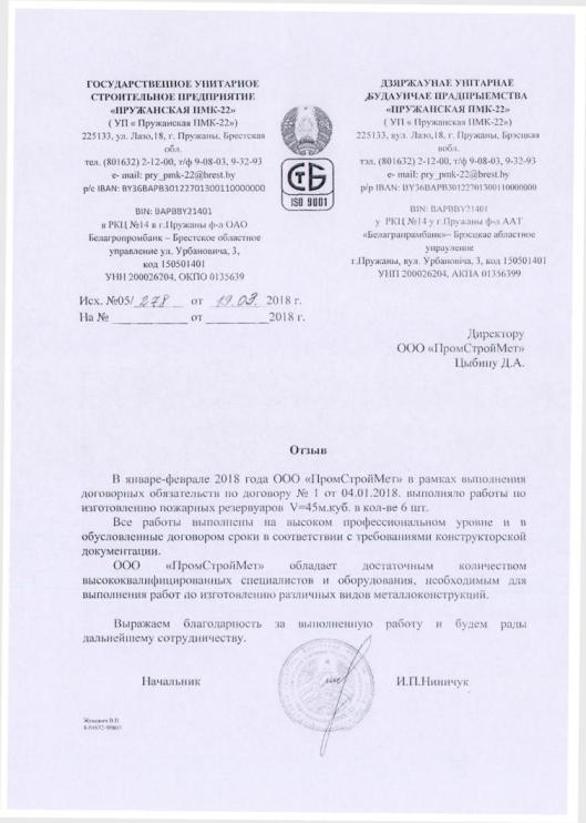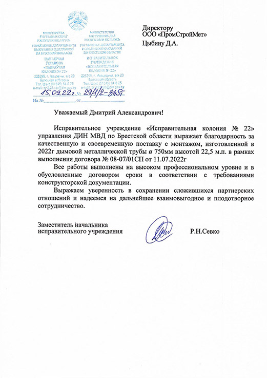 Исправительное учреждение «Исправительная колония № 22» управления ДИН МВД по Брестской области выражает благодарность за качественную и своевременную поставку с монтажом, изготовленной в 2022 г. дымовой металлической трубы диаметром 750 мм высотой 22,5 м.п. в рамках выполнения договора № 08-07/01СП от 11.07.2022 г.
