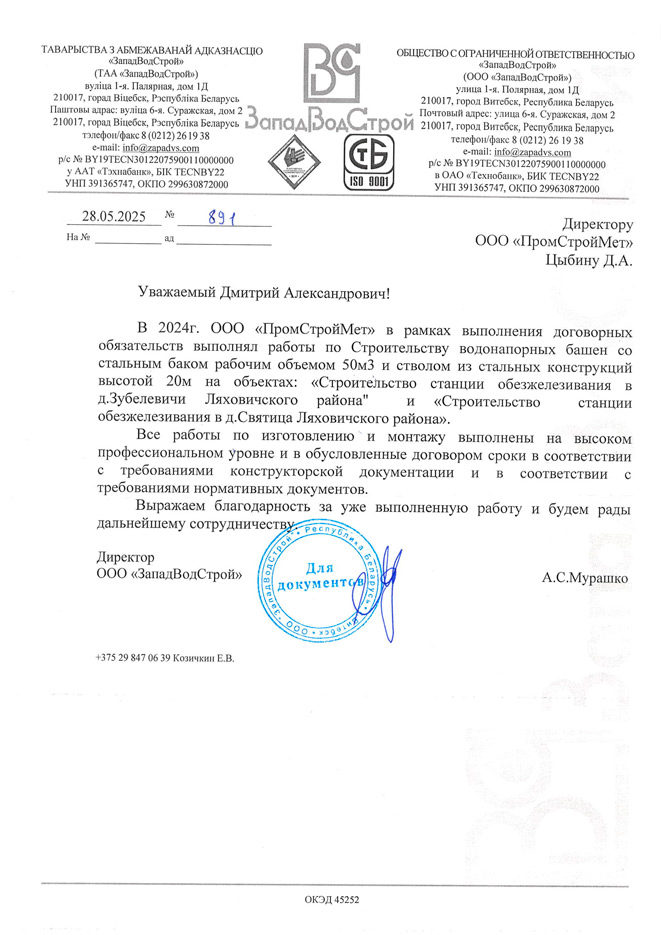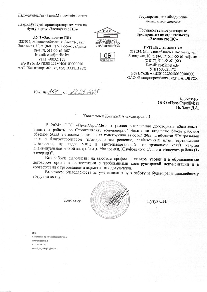 В 2024 г. ООО «ПромСтройМет» в рамках выполнения договорных обязательств выполнял работы по Строительству водонапорной башни со стальным баком рабочим объемом 50 куб.м. и стволом из стальных конструкций высотой 20 м на объекте: "Генеральный план с благоустройством (планировочное решение, разбивочный план, вертикальная планировка, прокладка улиц и внутриквартальной водопроводной сети) квартал индивидуальной жилой застройки д. Масловичи, Юзуфовского с/совета Минского района (1- я очередь)".