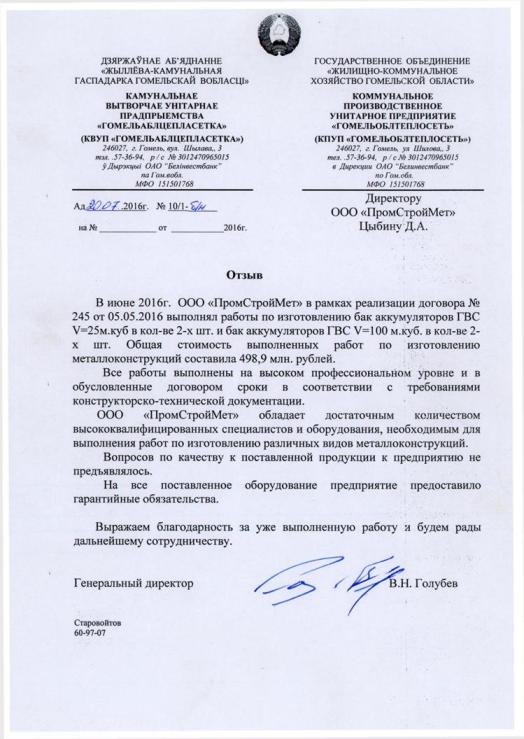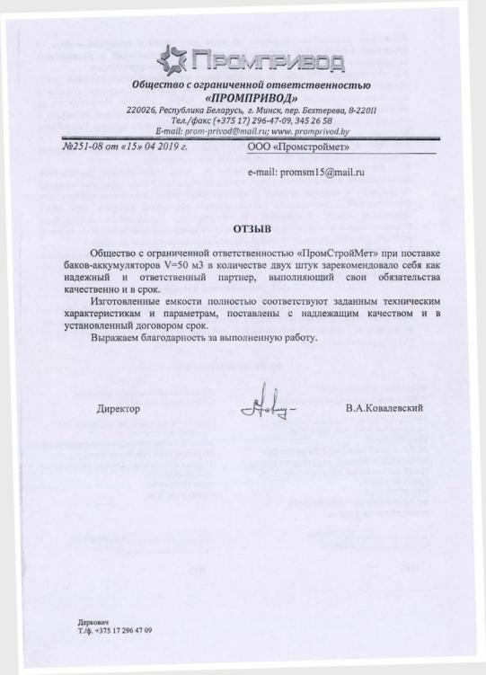 Общество с ограниченной ответственностью «ПромСтройМет» при поставке баков-аккумуляторов V=50 м3 в количестве двух штук зарекомендовало себя как надежный и ответственный партнер, выполняющий свои обязательства качественно и в срок.