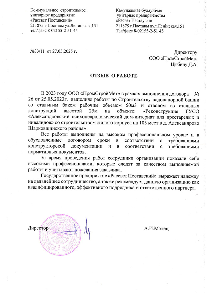 В 2023 году ООО «ПромСтройМет» в рамках выполнения договора № 26 от 25.05.2023г. выполнял работы по Строительству водонапорной башни со стальным баком рабочим объемом 50 куб.м. и стволом из стальных конструкций высотой 25 м на объекте: «Реконструкция ГУСО «Александровский психоневрологический дом-интернат для престарелых и инвалидов» со строительством жилого корпуса на 105 мест в д. Александрово Шарковщинского района» .