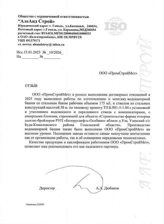 ООО «ПромСтройМет» в рамках выполнения договорных отношений в 2025 году выполняло работы по изготовлению и монтажу водонапорной башни со стальным баком рабочим объемом 175 м3, и стволом из стальных конструкций высотой 30 м. по типовому проекту ТП Б.901-5-1.04 с установкой и утеплением водоносного и переливного ствола с компенсаторами, с анкерными блоками, стремянкой для объекта «Строительство фермы откорма цыплят-бройлеров РУП «Белоруснефть-Особино» вблизи д.Уза, Узовский с/с Буда-Кошелевского района Гомельской области». Производство водонапорной башни также было выполнено ООО «ПромСтройМет» на высоком уровне. Посещение завода оставило самые наилучшие впечатления как от организации работы, так и об оснащении передовыми технологиями.
