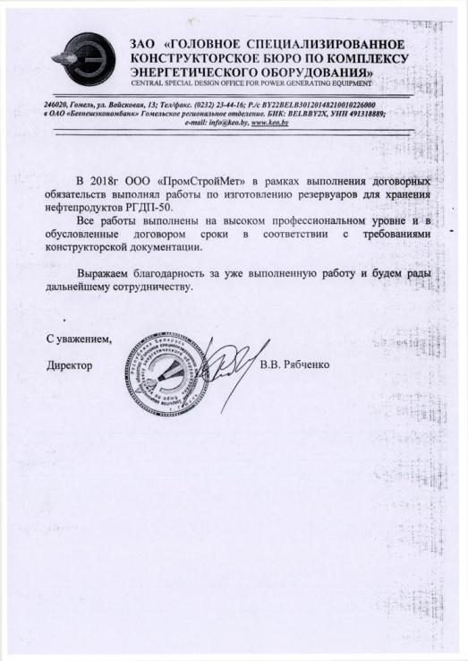 В 2018 году ООО «ПромСтройМет» в рамках выполнения договорных обязательств выполнял работы по изготовлению резервуаров для хранения нефтепродуктов РГДП-50.