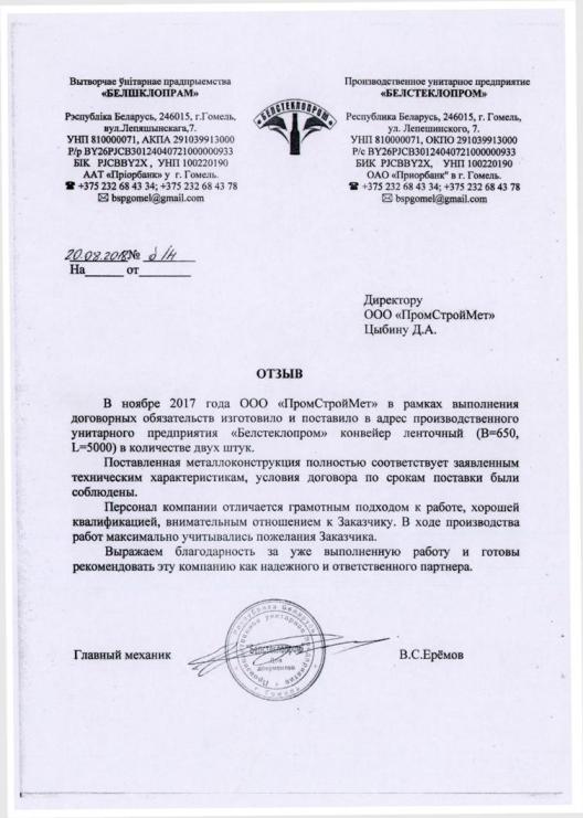 В ноябре 2017 года ООО «ПромСтройМет» в рамках выполнения договорных обязательств изготовило и поставило в адрес производственного унитарного предприятия «Белстеклопром» конвейер ленточный (В=650, L=5000) в количестве двух штук.