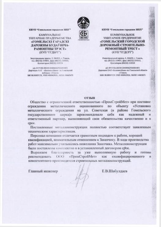 Общество с ограниченной ответственностью «ПромСтройМет» при поставке ограждения металлического оцинкованного по объекту «Установка металлического ограждения на ул. Советская (в районе Гомельского государственною цирка)» зарекомендовало себя как надежный и ответственный партнер, выполняющий свои обязательства качественно и в срок