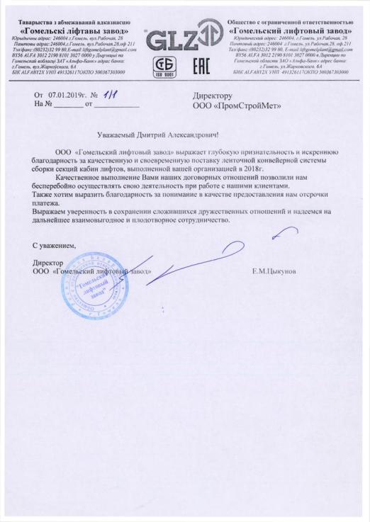 ООО «Гомельский лифтовый завод» выражает глубокую признательность и искреннюю благодарность за качественную и своевременную поставку ленточной конвейерной системы сборки секций кабин лифтов, выполненной вашей организацией в 2018г.