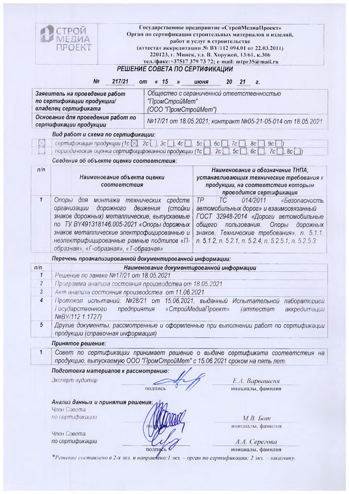 В рамках исполнения договора на изготовление опор дорожных знаков, предприятием получен Сертификат соответствия выпускаемой продукции требованиям ТР ТС 014/2011 "Безопасность автомобильных дорог". Действие Сертификата распространяется на опоры для монтажа технических средств организации дорожного движения: опоры знаков дорожных металлические рамные (РМГ, РМТ, РМП, ОРМП), стоечные (СКМ). Изготовление вышеуказанной продукции без наличия данного Сертификата запрещено.