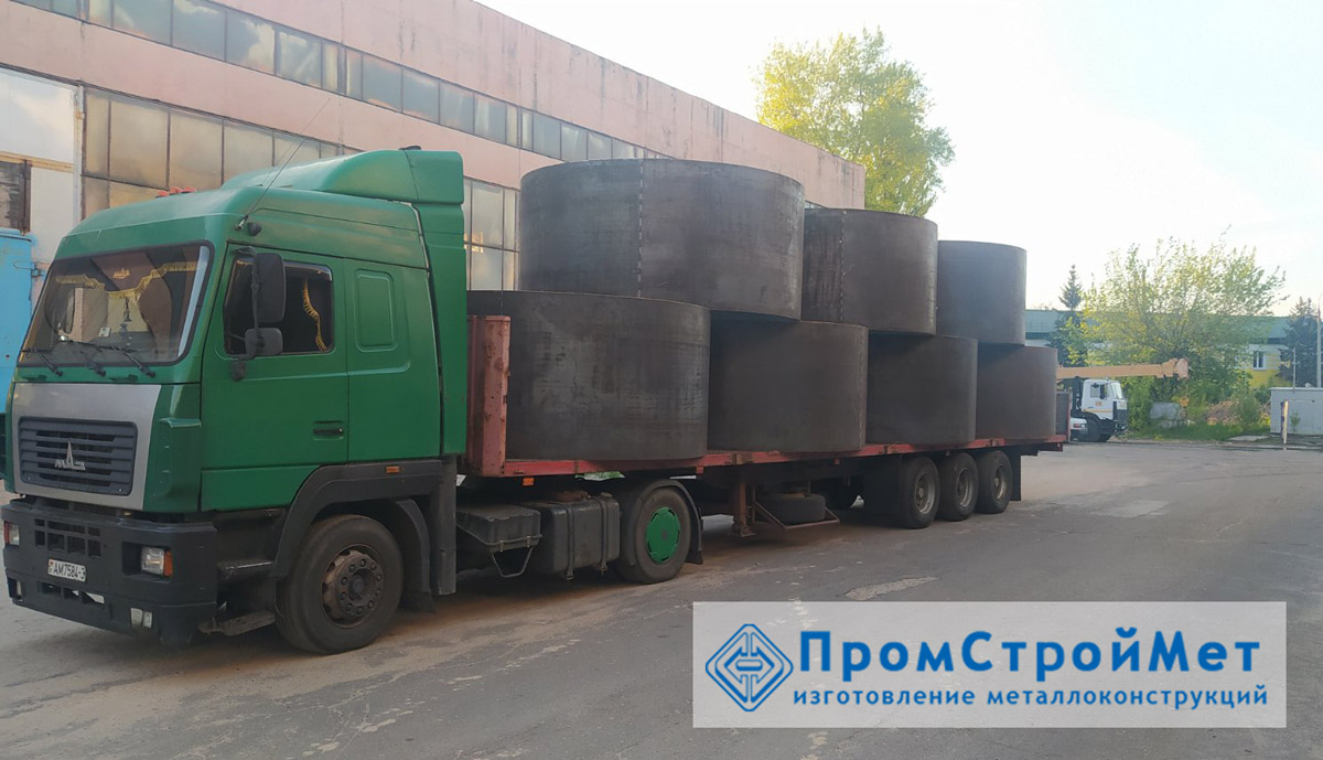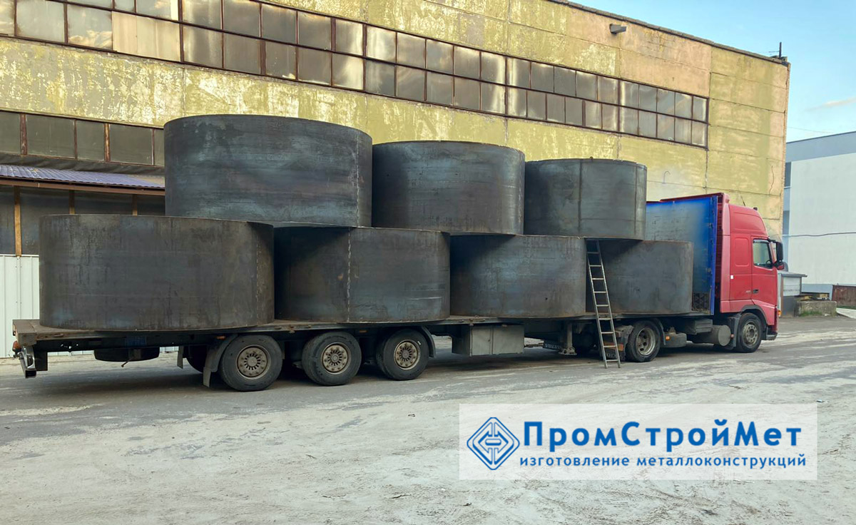 Металлоизделия изготовлены для унитарного строительного предприятия "Трест "Реммонтажстрой" (г. Солигорск Минской области). Диаметр одной единицы - 3200 мм., высота - 1500 мм., масса - 1,2 тонны, толщина металла - 10 мм.