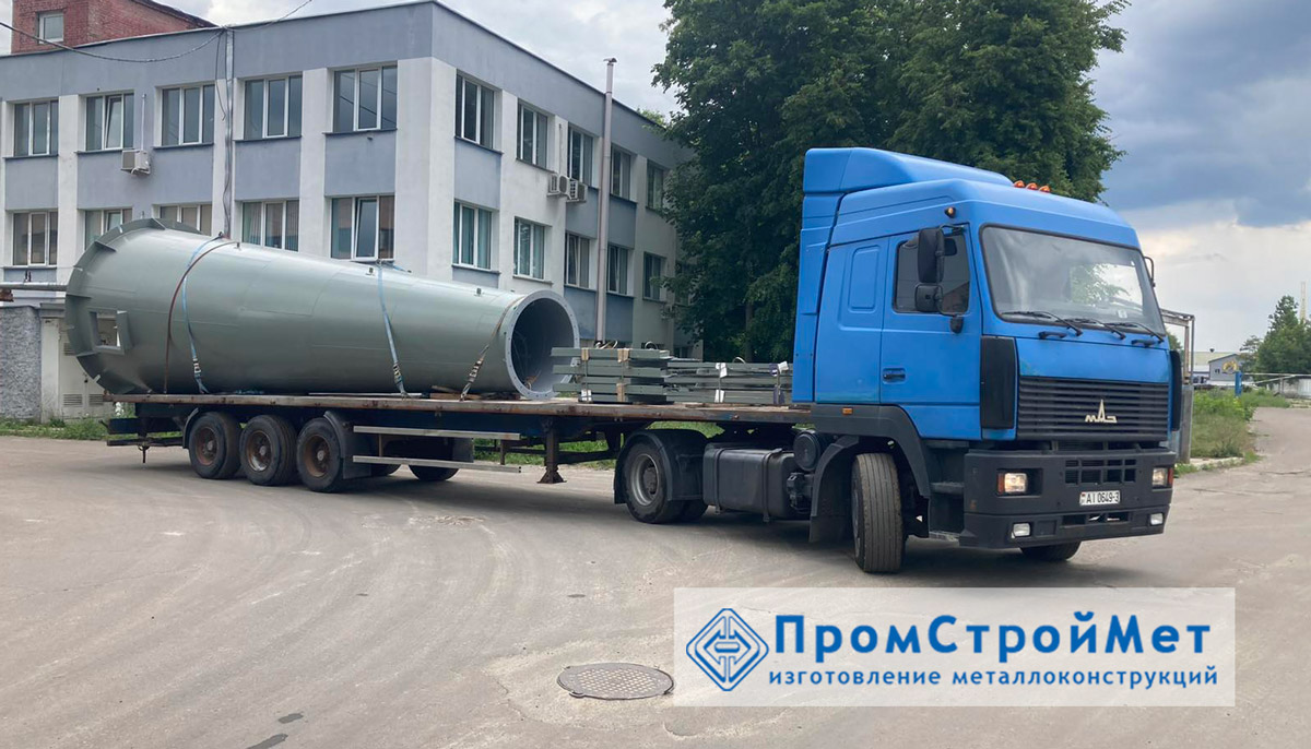 Самонесущая труба высотой 20 метров диаметром 1,2 метра была изготовлена для коммунального сельскохозяйственного унитарного предприятия «Тепличное» (д. Березки, п/о Улуковье) по типовому проекту № 907-2-275.89.