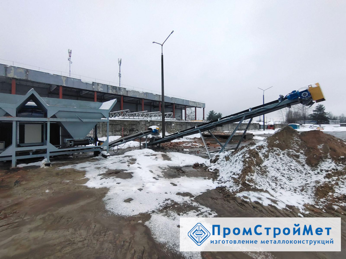 Конвейер ленточный приставной отводящий с опорой с роторным узлом смешивания состоит из рамы, представляющей собой сварную конструкцию, состоящую из уголков и швеллеров, на которой смонтированы приводной и натяжной барабаны, роторный барабан узла смешивания, конвейерная лента. Конвейер удерживается на V-образной опоре, обеспечивающей подъем и выгрузку готового состава в самосвал, склад или отвал. Привод осуществляется через мотор-редуктор или от электродвигателя через редуктор на приводной барабан посредством ременной передачи.