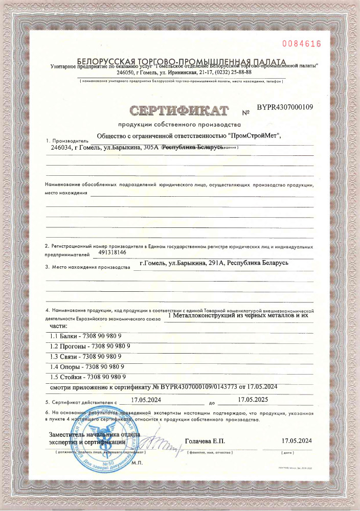 Предприятием получен Сертификат продукции собственного производства на металлоконструкции из черных металлов и их части (pdf):