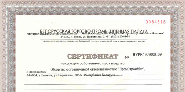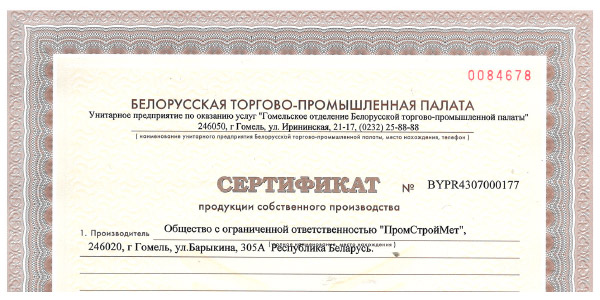Получен Сертификат продукции собственного производства на металлоконструкции из черных металлов и их части!