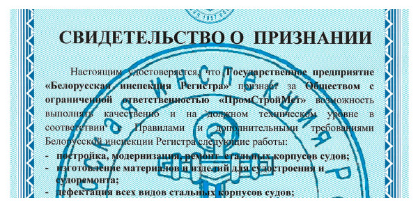 Получено Свидетельство о признании РУП "Белорусская инспекция Регистра"!