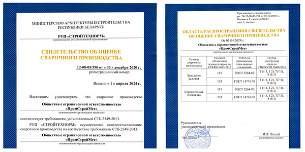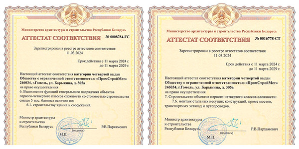 Получены аттестаты соответствия категории четвертой от Министерства архитектуры и строительства Республики Беларусь