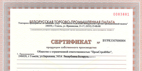 Получен Сертификат продукции собственного производства на металлоконструкции из черных металлов и их части!