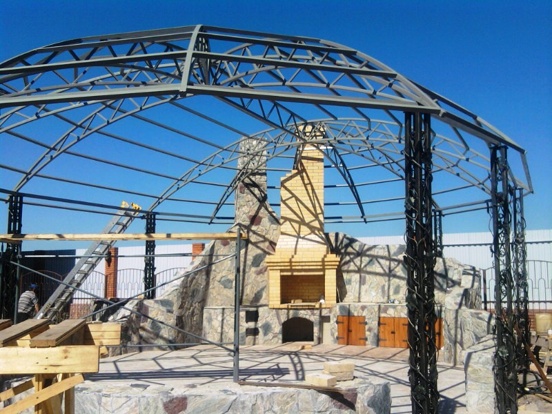 Стрельчатые металлические арки благодаря большому уклону пролетов позволяют равномерно распределить любую нагрузку. Такая конструкция прочна и долговечна, она также широко распространена как декоративная деталь.
