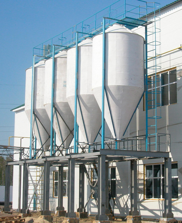 Днище бункеров (силосов) чаще коническое для саморазгрузки или плоское со шнеком. Устанавливаются на опорах.