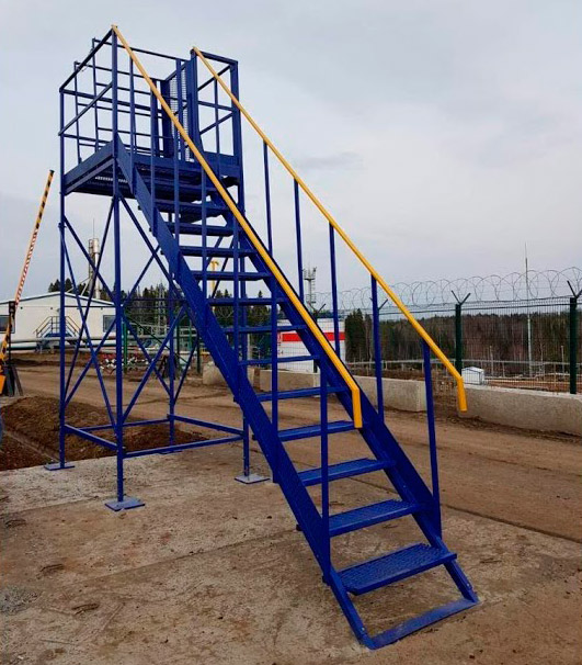Площадка состоит из металлических конструкций, лестницы, которая расположена вертикально или под наклоном, поручней или других ограждений. Поручни и ограждения отвечают за безопасность работников. Настил, по которому можно ходить, часто изготавливают из решетчатого металла, чтобы избежать скопления жидкости, осадков в пешеходной зоне, устранить опасность скольжения. Ячеистая структура настила пропускает воздух, не дает задерживаться воде, что предотвращает гниение и порчу металла.