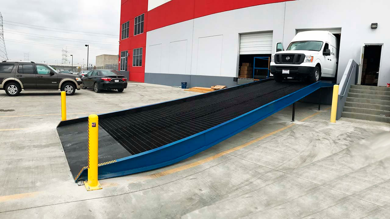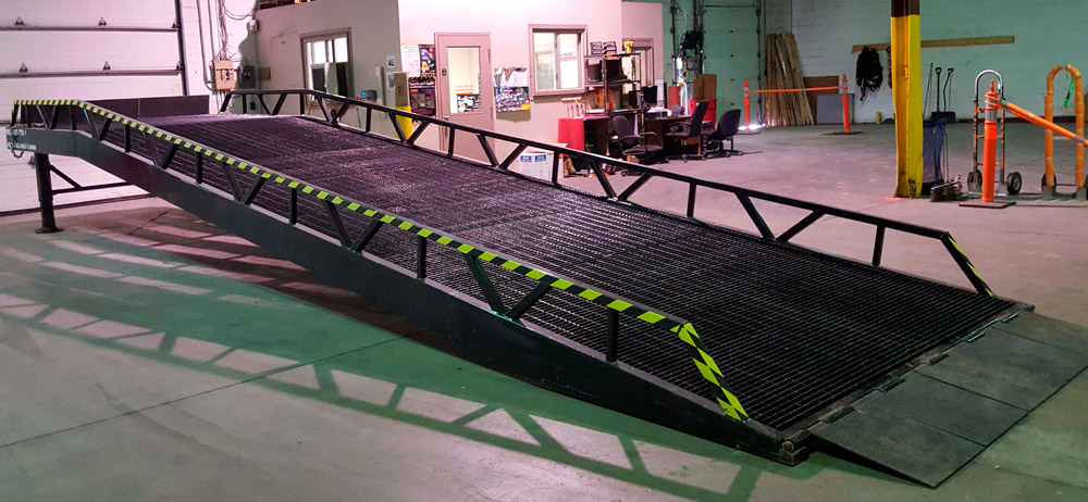 Конструкция стационарной рампы простая, фиксируется болтами или цепями. Надежность достигается равномерным распределением нескольких опорных точек. Не только погрузчик, но и грузовик может заехать, не испытывая скольжения из-за решетчатого настила. Конструкция выполняется из стали, добавлены ребра жесткости, длиной 8,3-12,3 метров. Подъем груза от 6 до 10 т. Около 2 метров шириной. Безопасность въезда обеспечивается бортиками. Бетонировать опоры нет необходимости.