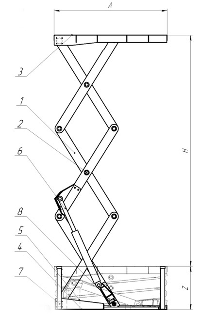 Минимальная высота стола в нижнем положении зависит от количества «ножниц» в механизме гидравлического подъемника, от массивности элементов конструкции и от толщины платформы, что, в основном, определяется грузоподъемностью. Подъемники с большой грузоподъемностью и с большой высотой подъема имеют наибольшую высоту в опущенном состоянии, что делает не удобным их использование без приямка, в котором прячется сложенный механизм.