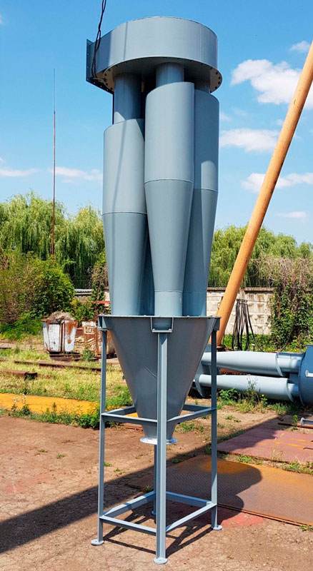 Для работы циклона требуется вентилятор улитка, он может нагнетать или разрежать воздух в агрегате. В нижней части расположен технологический люк с задвижкой, через которую собранная пыль и твердые частицы из воздуха попадают в бункер накопитель. Циклоны могут быть оборудованы зонтиком, который защищает выходное отверстие от попадания атмосферных осадков. Также на выходное отверстие дополнительно может быть установлен мешок для сбора пыли. Зачастую система очистки воздуха представляет собой не один циклон, а несколько одинаковых агрегатов с общими аэродинамическими условиями, объединенных в батарею.