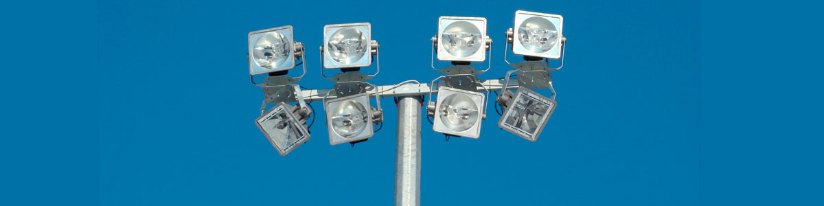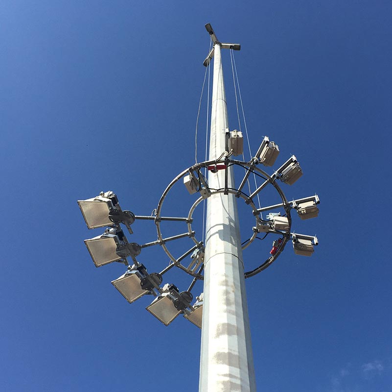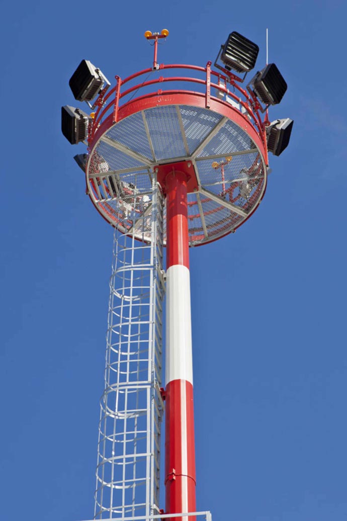 Чтобы территория освещалась равномерно, применяются прожекторные мачты освещения высотой 12–50 м. Монтажная опорная конструкция отлично справляется с нагрузкой от осветительных приборов, вне зависимости от массы, габаритов, количества источников света, воздействия внешних факторов. Прожекторные мачты позволяют целиком осветить территорию любой площади без затененных участков.