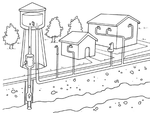 - с помощью насоса по подающему трубопроводу происходит забор воды из подземной скважины, реки, озера в накопительный бак, смонтированный наверху башни;