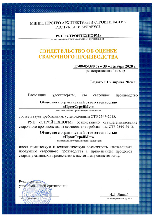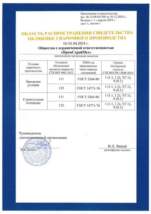 ООО "ПромСтройМет" имеет свидетельство об оценке сварочного производства, подтверждающий высокий уровень сварочного производства: