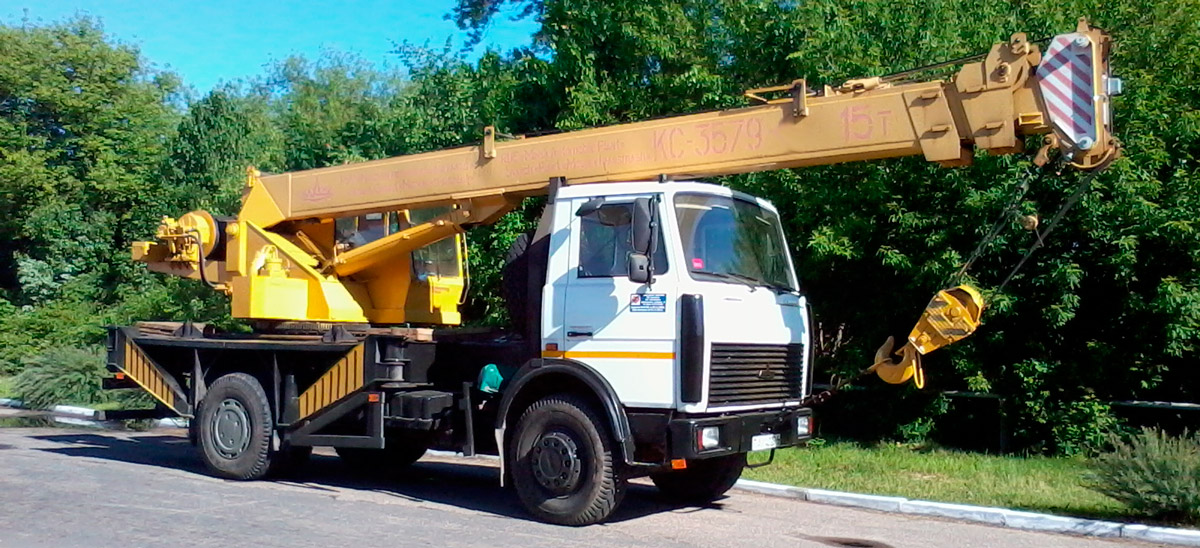 Автомобильный гидравлический кран КС-3579-3 грузоподъемностью 15 тонн предназначен для выполнения погрузочно-разгрузочных и строительно-монтажных работ с обычными грузами на рассредоточенных объектах.